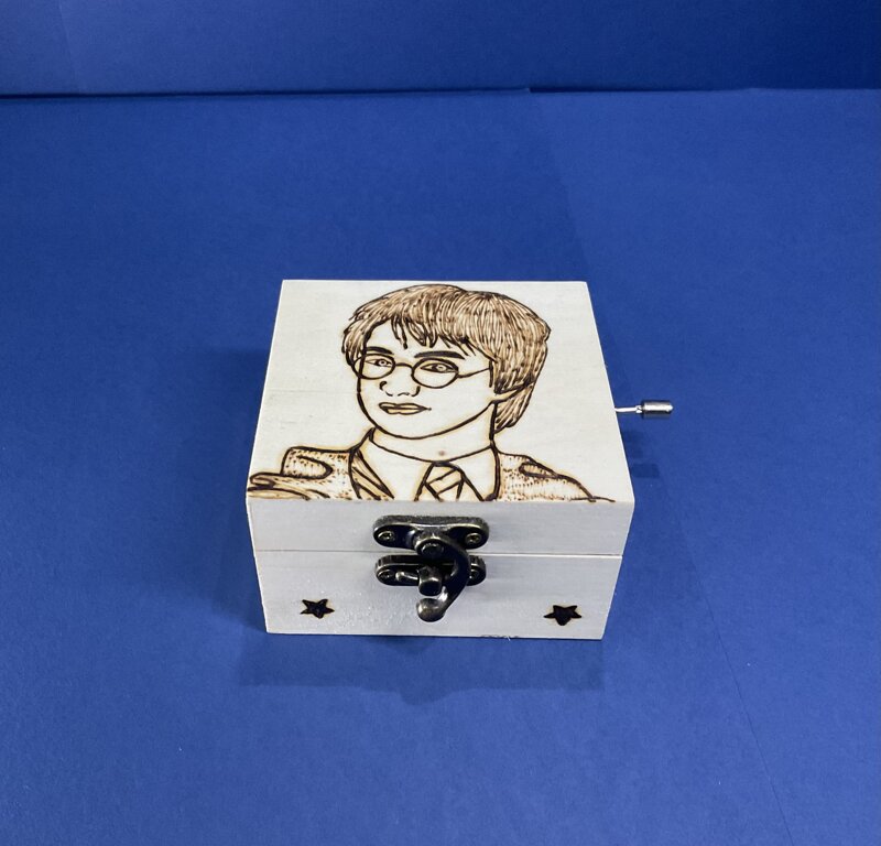 cofanetto legno carillon musica H.P., disegno cartoni animati, con chiusura metallica.