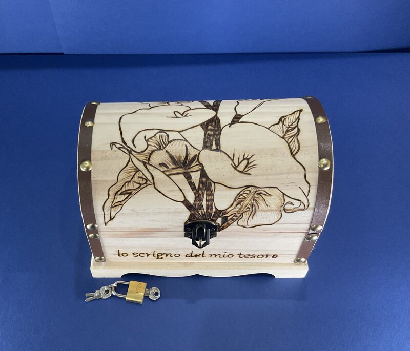 cofanetto legno a scrigno, disegno floreale, con chiusura metallica e lucchetto.