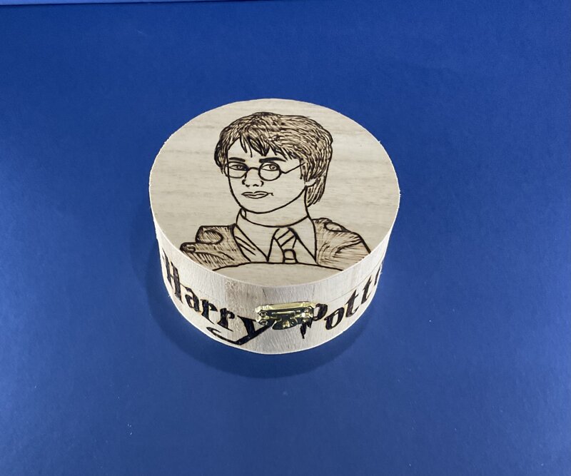 cofanetto tondo legno, disegno cartoni animati, con chiusura metallica.