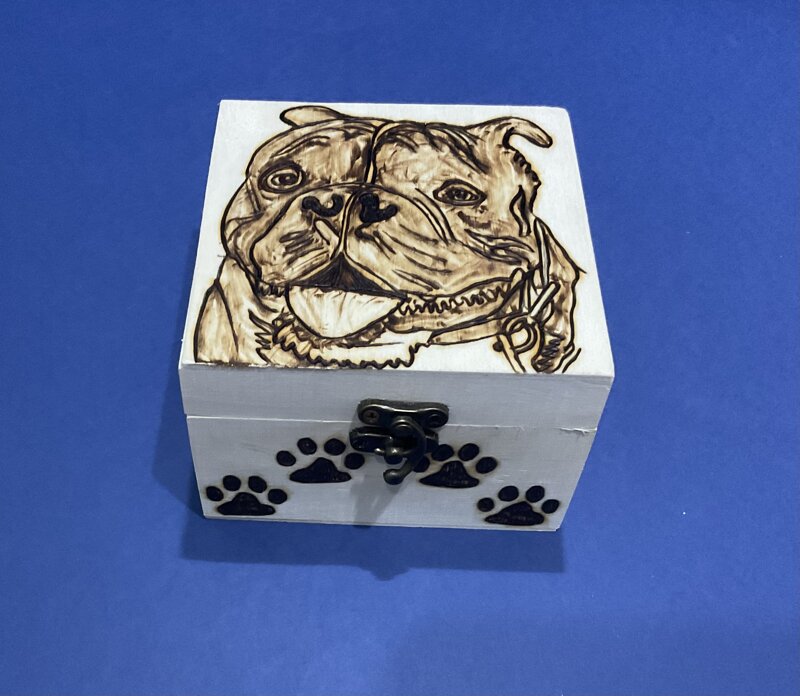 cofanetto legno, disegno cagnolino, con chiusura metallica.