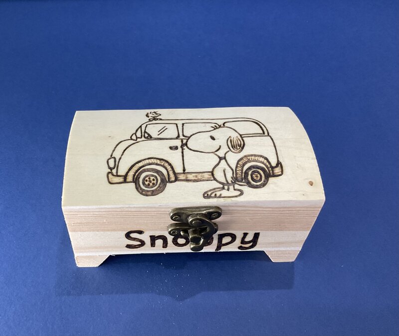 cofanetto legno, disegno cartoni animati, con chiusura metallica.