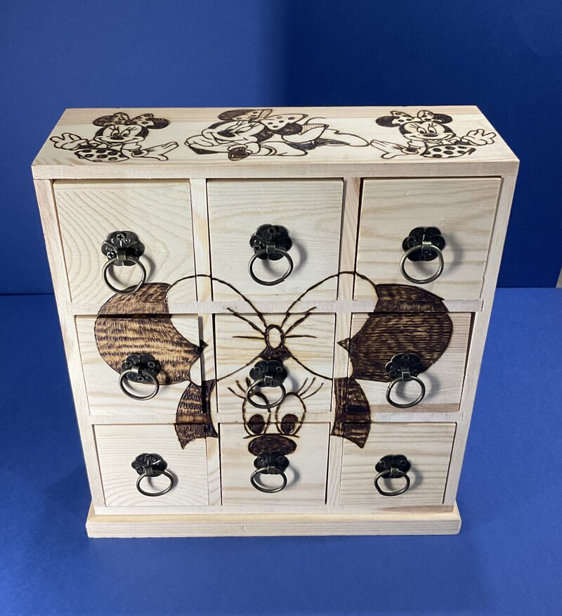 cassettiera legno, disegno cartoni animati, 9 cassetti con maniglia metallica.
