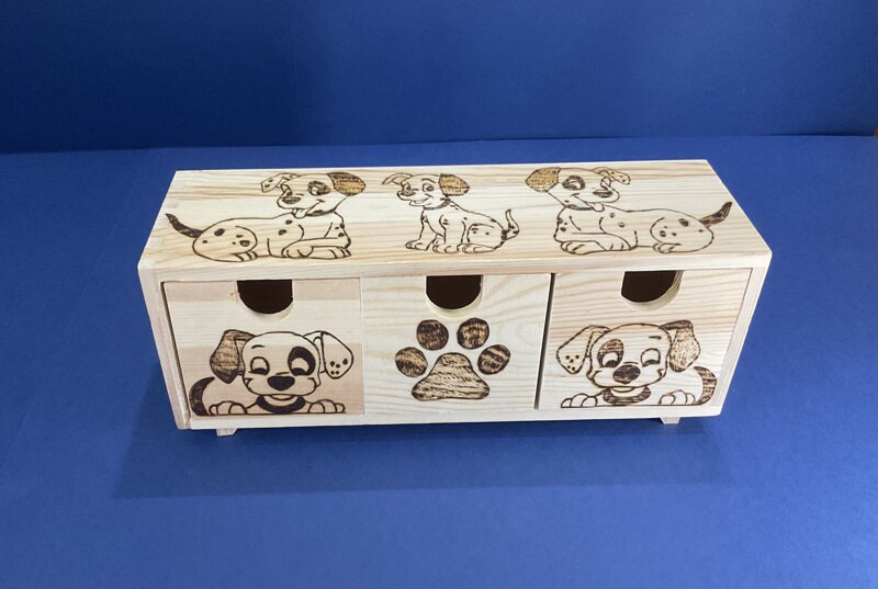 cassettiera legno 3 cassettini, disegno 3 cagnolini.