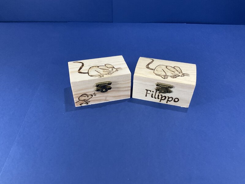 cofanetto legno porta dentini, disegno topolino, con chiusura metallica.
