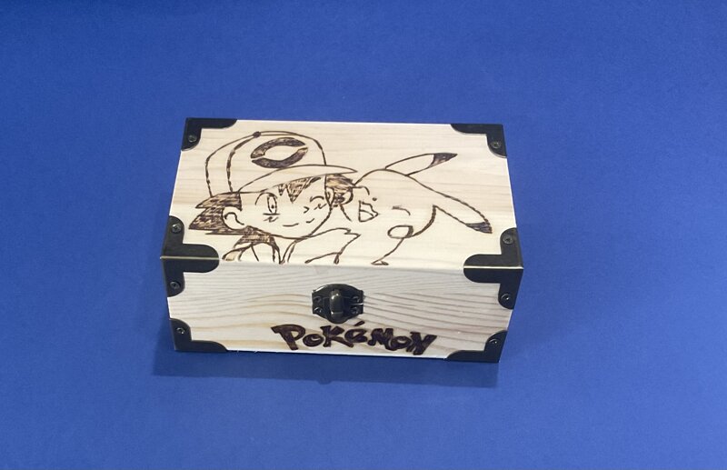 cofanetto legno, disegno cartoni animati, con chiusura e spigoli metallici.