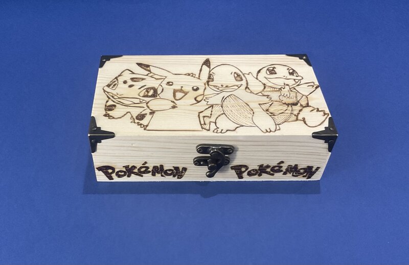 cofanetto legno, disegno cartoni animati, con chiusura e spigoli metallici.