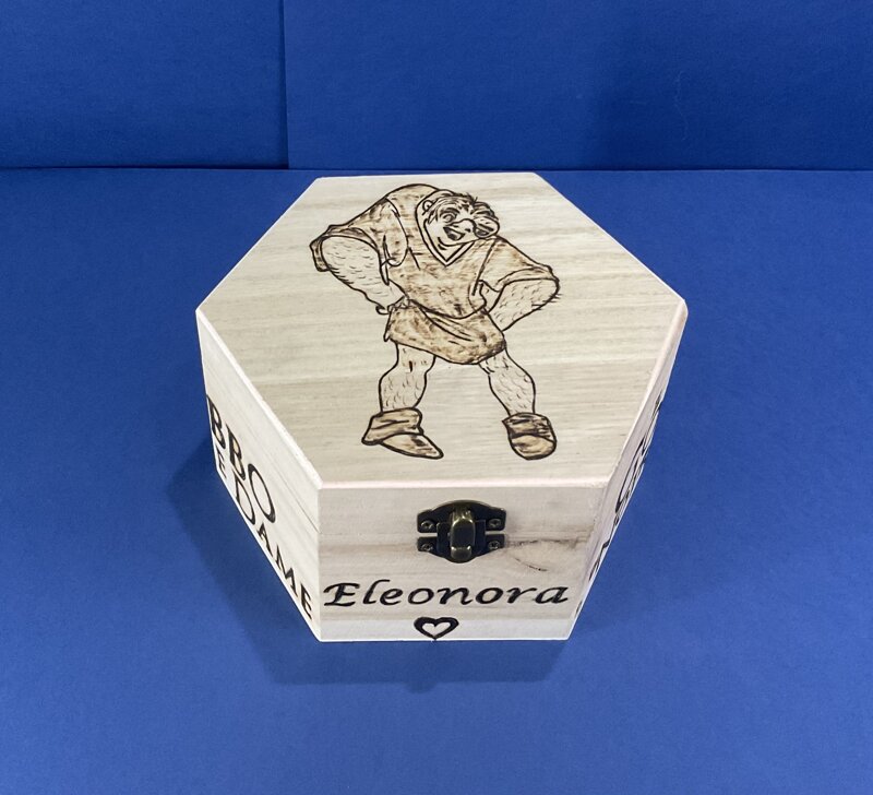 cofanetto esagonale legno, disegno cartoni animati, con chiusura metallica.