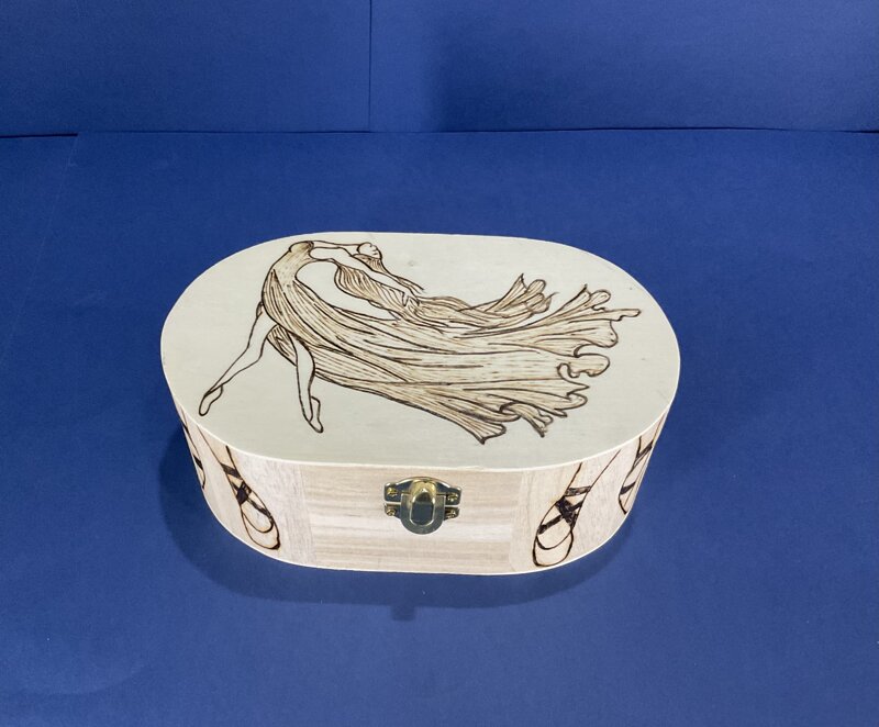 cofanetto ovale legno, disegno ballerina, con chiusura metallica.