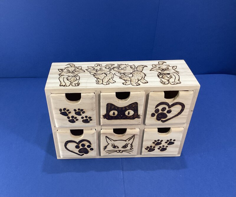 cassettiera legno 6 cassettini, disegno 4 gattini.