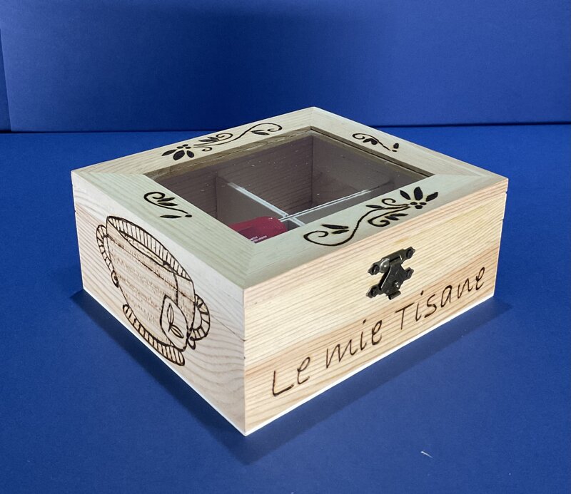 cofanetto legno portatisane 4 scomparti, disegno tazzina, con chiusura metallica.
