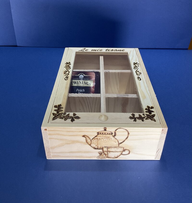 cofanetto legno portatisane 6 scomparti, disegno teiera e tazzina, coperchio scorrevole.