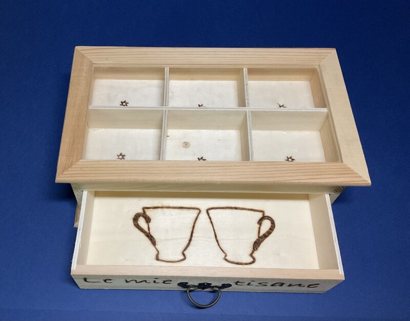 Cofanetto legno portatisane, con vetro, disegno tazzine. 6 scomparti e cassetto con maniglia metallica.