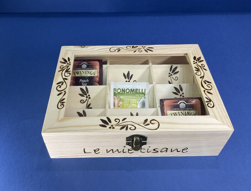 portatisane legno coperchio vetro, disegno floreale con teiera, 9 scomparti obliqui, con chiusura metallica.