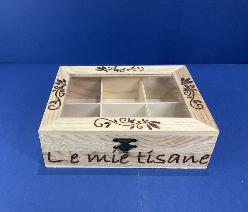 portatisane legno coperchio vetro, disegno floreale con teiera, 6 scomparti, con chiusura metallica.