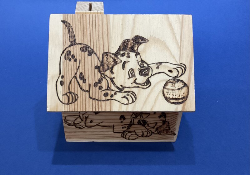 salvadanaio casetta legno Love, disegno cagnolino.