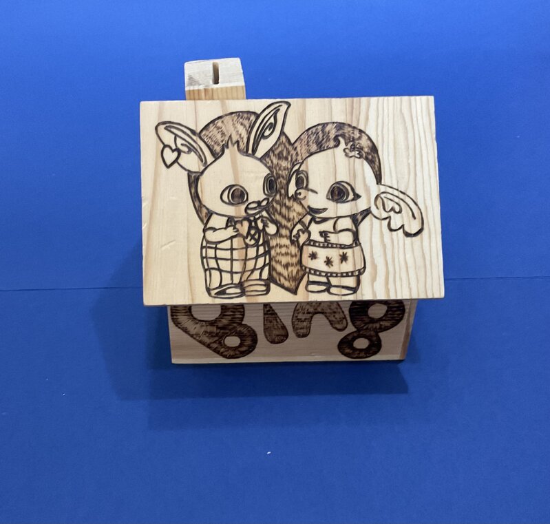 salvadanaio casetta legno Love, disegno cartoni animati.