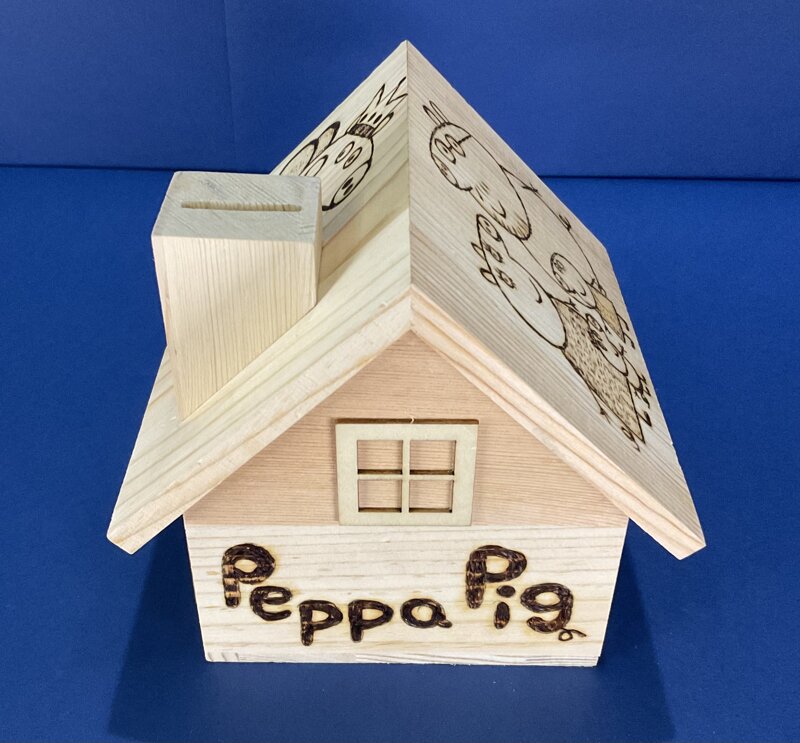 salvadanaio legno a casetta Love, disegno cartoni animati.