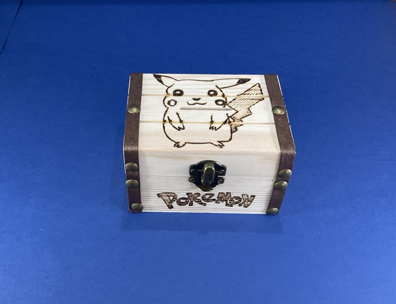 salvadanaio legno strisce laterali marron, disegno cartoni animati, con chiusura metallica.