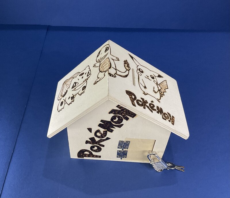 salvadanaio legno a casetta con porticina e lucchetto, disegno cartoni animati.