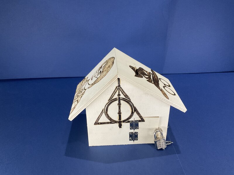salvadanaio legno a casetta con porticina e lucchetto, disegno cartoni animati.