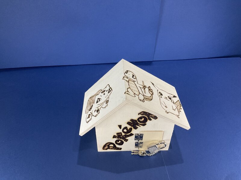 salvadanaio legno a casetta con porticina e lucchetto, disegno cartoni animati.