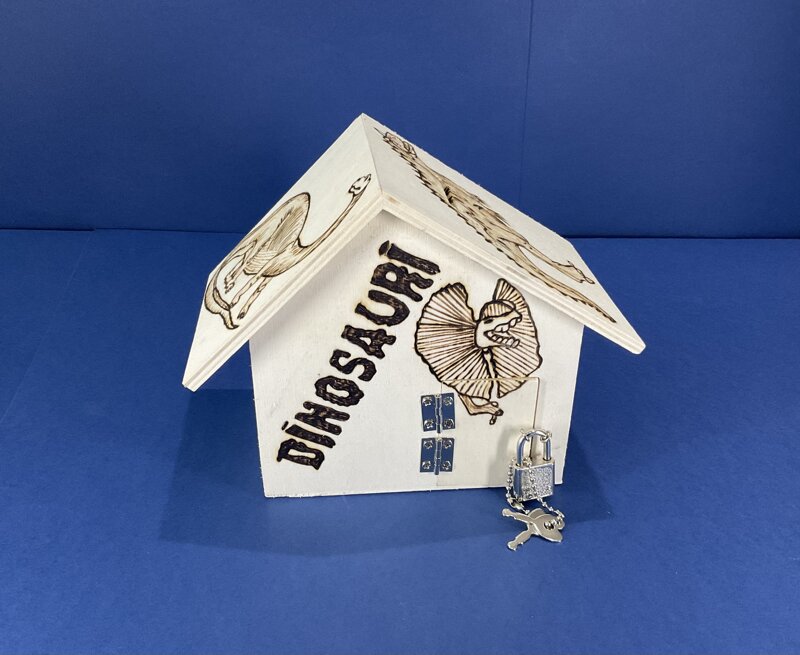 salvadanaio legno a casetta con porticina e lucchetto, disegno dinosauri.