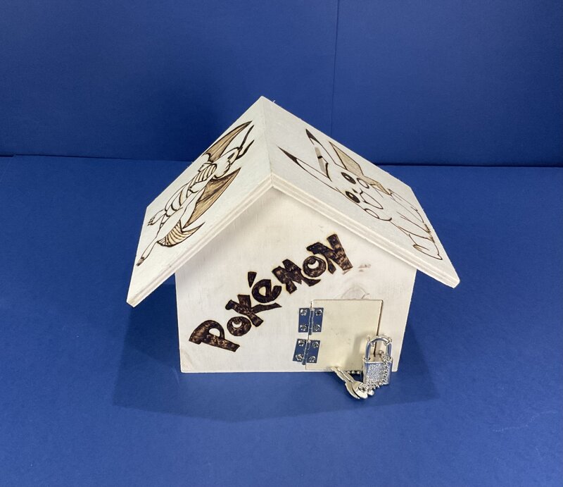 salvadanaio legno a casetta con porticina e lucchetto, disegno cartoni animati.