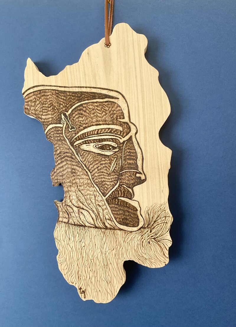 Sardegna legno, disegno maschera mamuthones, con laccio.