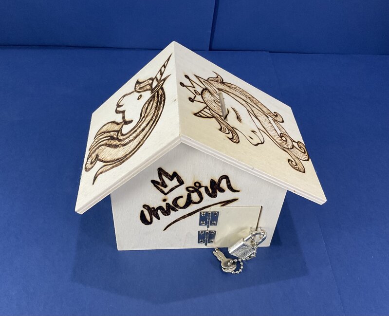 salvadanaio legno a casetta con porticina e lucchetto disegno cartoni animati